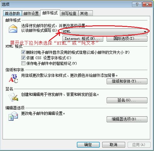 · 選擇“郵件格式”選項板-〉在“以該郵件格式撰寫”處選擇“HTML”或“純文本”