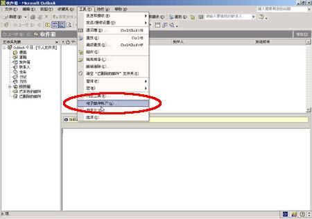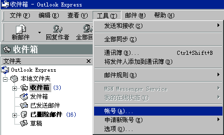 2.從菜單中選擇'工具/帳號'菜單項,打開'電子郵件帳號'窗口;