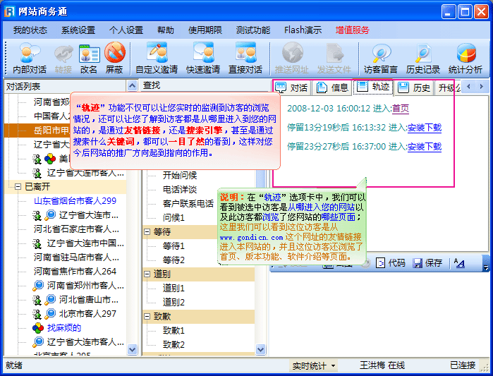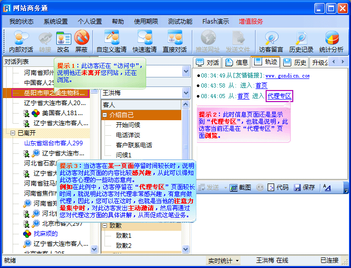 (2).利用“軌跡跟蹤”的功能您可以在了解訪客的意向后對訪客發出主動邀請,從而可以使您的客戶接待更具有針對性和目的性,如(圖2);