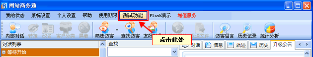 • 點擊網站商務通軟件后臺上方 “測試功能”按鈕,如(圖1)。