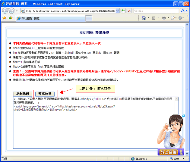 按“預覽效果”得到浮動圖標的網頁效果,如(圖6)。您感到滿意以后,請按“復制代碼”按鈕,然后在桌面建一個文本文檔,粘貼代碼。然后發給您的技術人員,加入網頁。