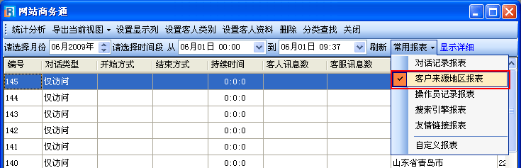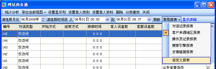 • 常用報表是用來隨時切換歷史記錄顯示內容的工具,是您可以更加快速直觀的了解過往訪客所在的地區、對話情況、來源途徑……而且您還可以通過自定義報表設置您所需要的顯示內容,更加切合您的實際需求。