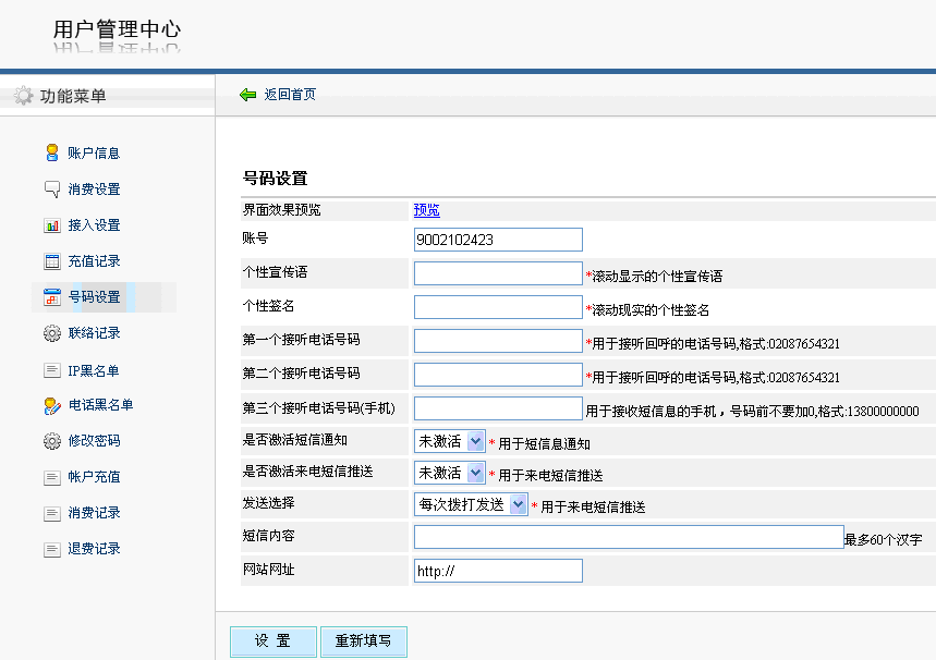 • 至此電話賬戶設置完畢。