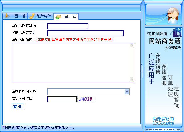 6. 網站商務通短信功能合作伙伴為分眾傳媒,所用接口是由分眾傳媒提供,大連忠仕軟件技術有限公司負責綁定在網站商務通里為用戶提供服務。 注:因為訪客隨時可以離開窗口,所以目前沒有開通客服手機發送到訪客對話窗口的功能。 如有問題可以隨時聯系大連忠仕軟件技術有限公司http://www.zoosnet.net