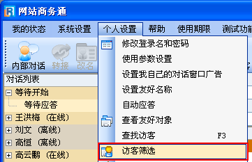 • 登陸網(wǎng)站商務(wù)通軟件,選擇“個(gè)人設(shè)置”,將點(diǎn)開的菜單下拉,選擇“訪客篩選”。如(圖1);