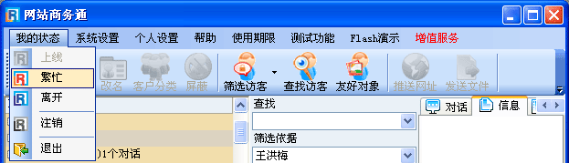 首先登錄網站商務通(LR)軟件,點擊“我的狀態”菜單項,在“我的狀態”的下拉菜單中選擇“繁忙”,如(圖1);