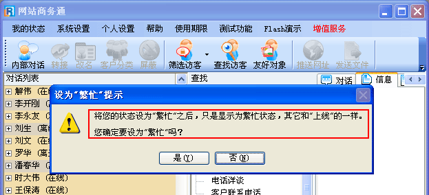 此時系統會自動彈出提示窗口,提示您設為“繁忙”之后只是顯示為“繁忙”實際上和“在線”一樣,請您確認是否要進行確認,如點“是”則退出網站商務通(LR)軟件,如(圖2);