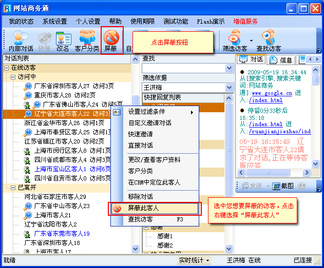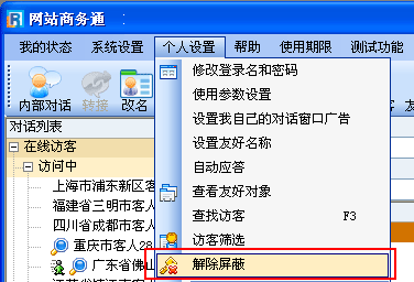 • 屏蔽與解除屏蔽對訪問中無理取鬧的客戶,可以采取屏蔽措施,不再受到該客戶的騷擾。