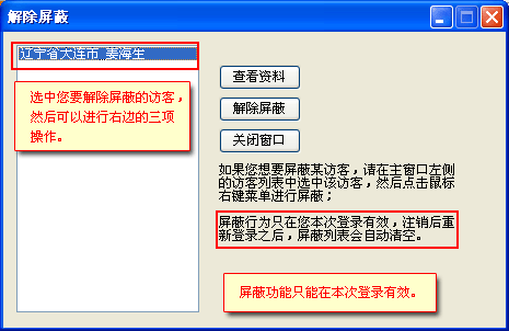 • 解除屏蔽:對剛剛屏蔽的訪客進行“解除屏蔽”的實際操作。如(圖3);