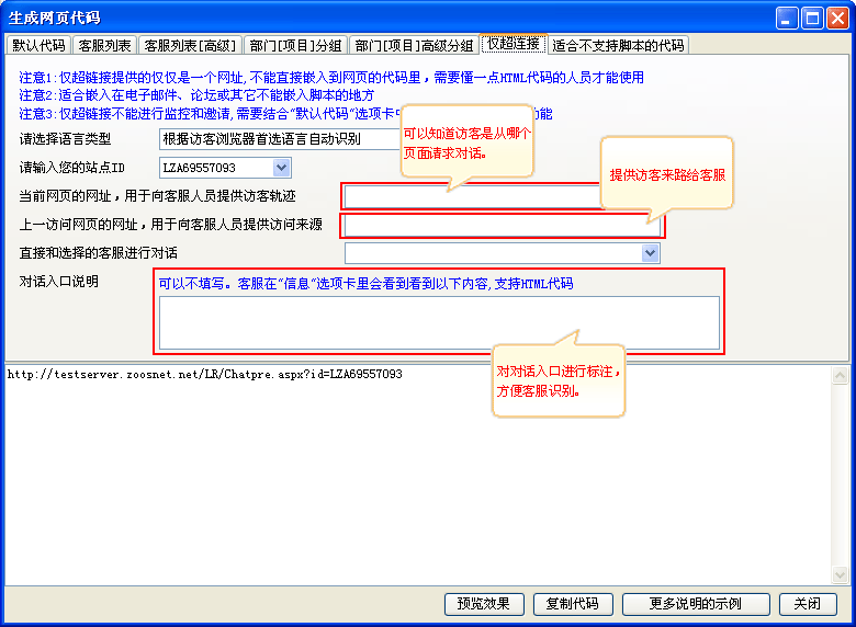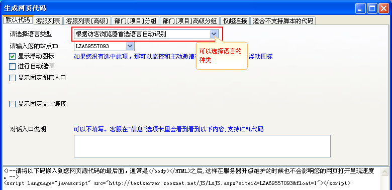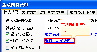 • 生成網頁代碼在安裝完網站商務通的客戶端以后,登錄后可以在系統設置---生成網頁代碼中生成你需要的代碼。