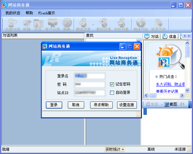 - 此時系統(tǒng)會彈出網(wǎng)站商務(wù)通(LR)客服端登錄窗口,輸入登陸名、密碼和站點ID后點擊“登陸”進(jìn)行登陸,如(圖3)