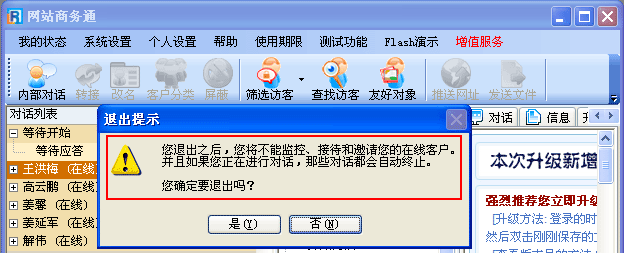 • 此時系統會自動彈出提示窗口,提示您退出之后將不能進行的一些操作,請您確認,如點“是”則退出網站商務通(LR)軟件,如(圖2);