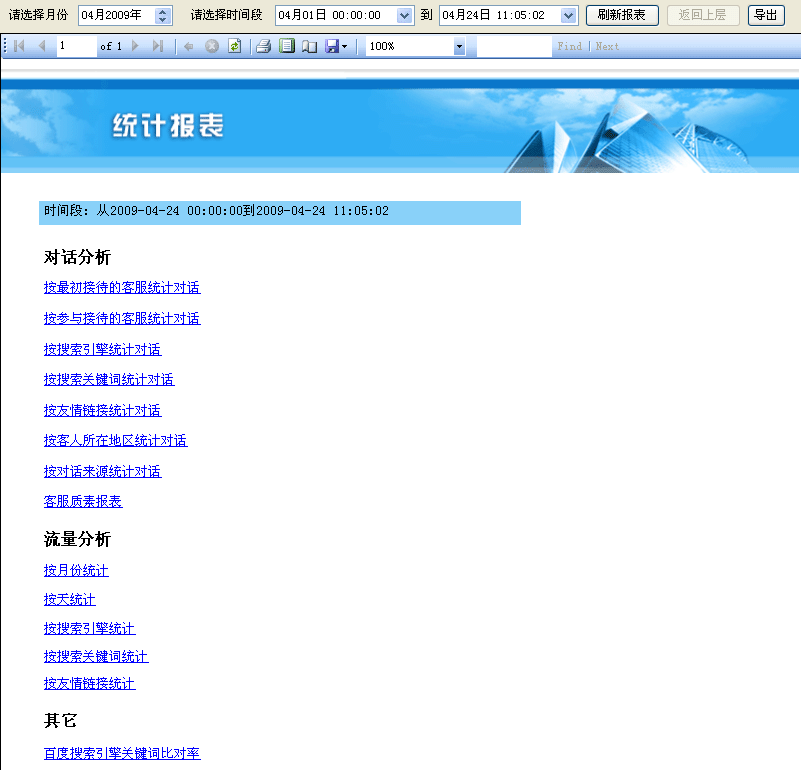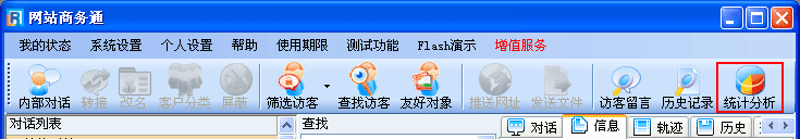 • 統(tǒng)計分析功能是對網(wǎng)站訪問和對話數(shù)據(jù)的一個綜合分析和整合,通過我們的提供的分析數(shù)據(jù)資料,可以為你提供第一手的網(wǎng)站參考數(shù)據(jù)。
