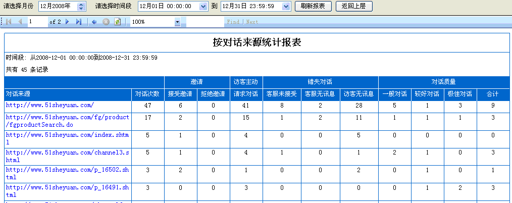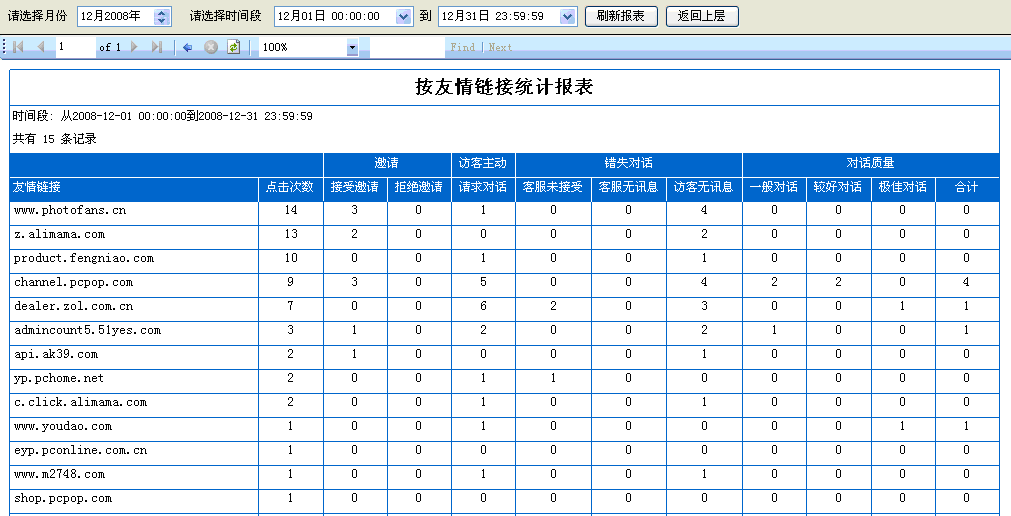 9. 按友情鏈接統(tǒng)計對話:所有通過其他網(wǎng)站友情連接過來的對話數(shù)據(jù)統(tǒng)計,如(圖7);