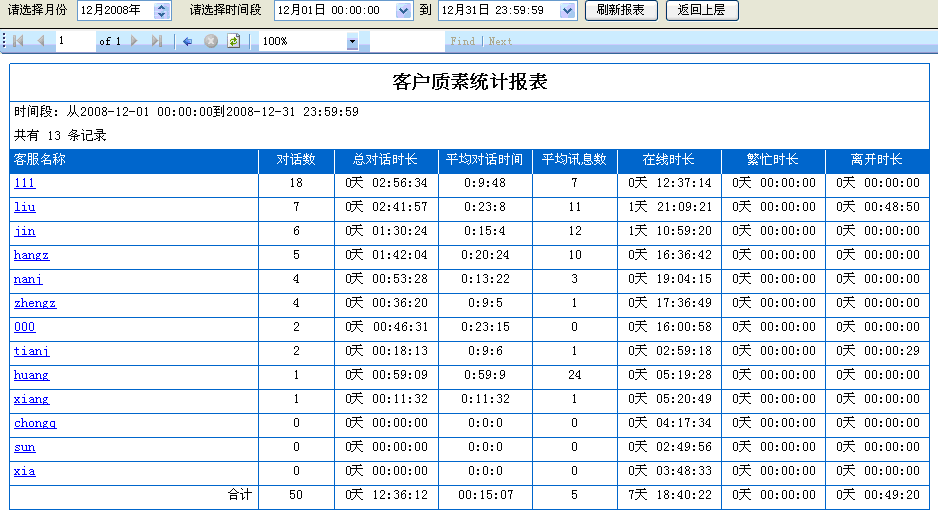 13. 客服素質(zhì)報表:考核客服在線整體狀態(tài)的一個數(shù)據(jù)統(tǒng)計,如(圖11);