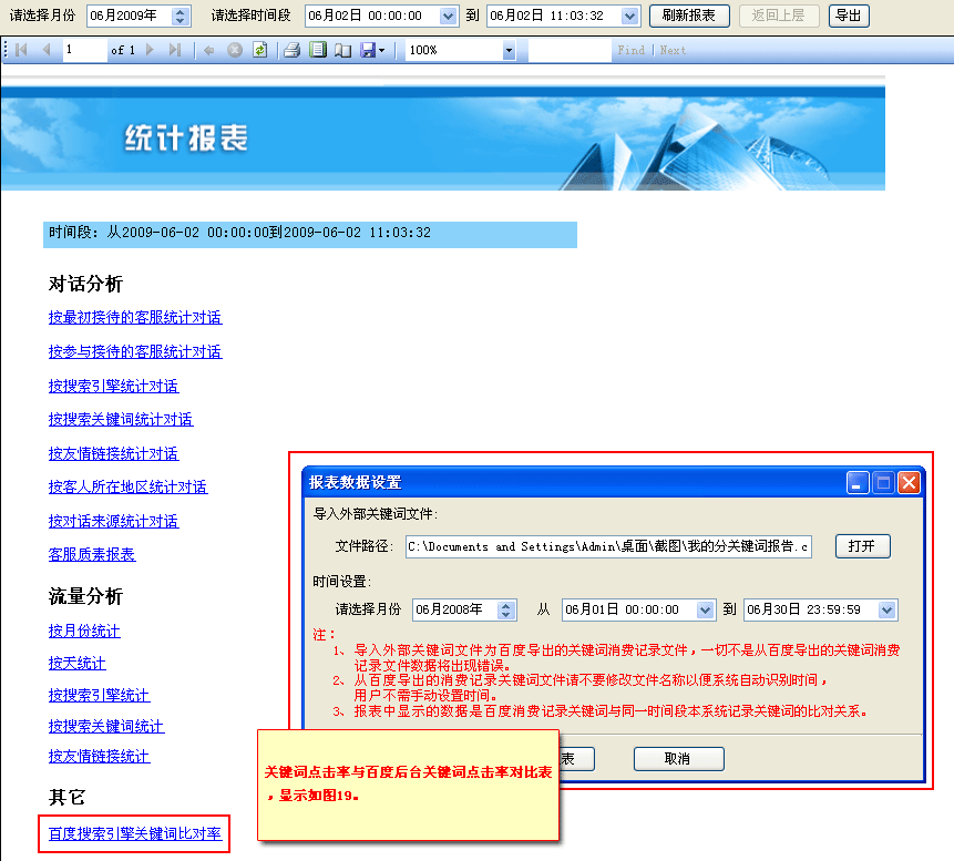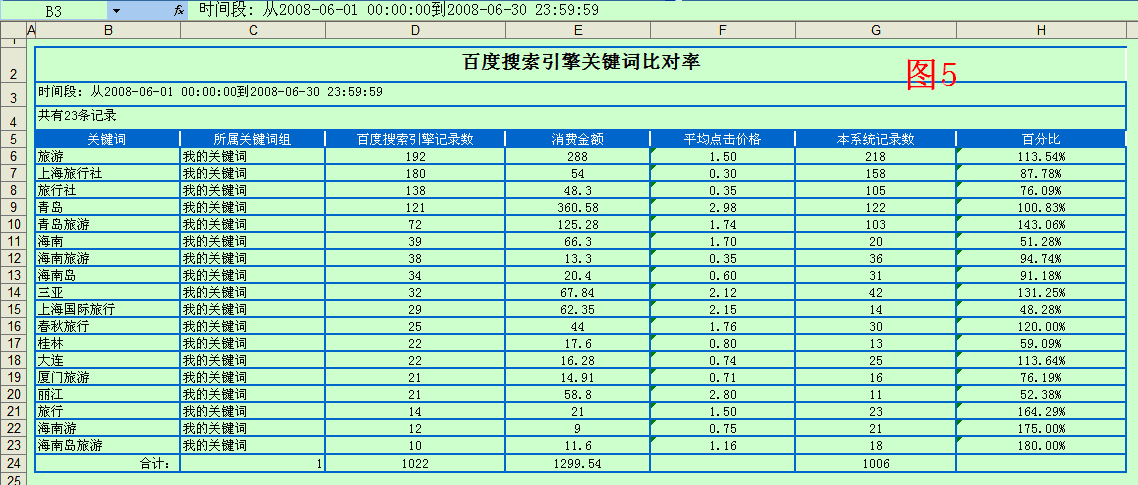 22. 百度搜索引擎關(guān)鍵詞比對率:提供了搜索關(guān)鍵詞與百度后臺關(guān)鍵詞點擊率的對比功能:如(圖18);