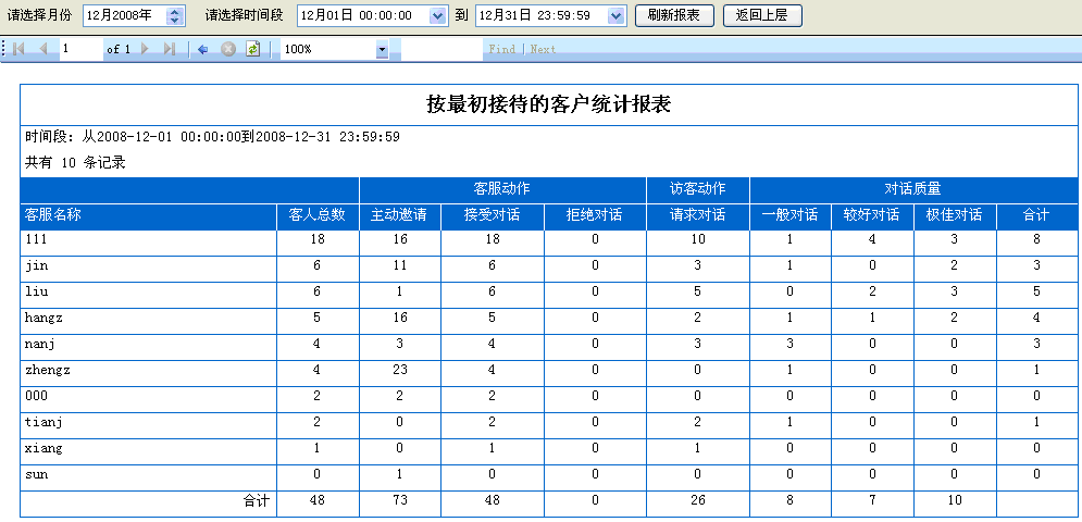 5. 按最初接待的客服統(tǒng)計對話:可以提供第一次接待訪客的客服數(shù)據(jù)統(tǒng)計報表,如(圖3);