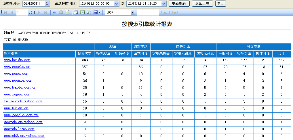 7. 按搜索引擎統(tǒng)計對話:所有通過搜索引擎數(shù)據(jù)統(tǒng)計,通過我們提供的報表,能更好的讓客戶知道,通過哪些搜索引擎過來的客人更愿意點擊對話,和客服進行溝通,也就是對話率高,如(圖5);
