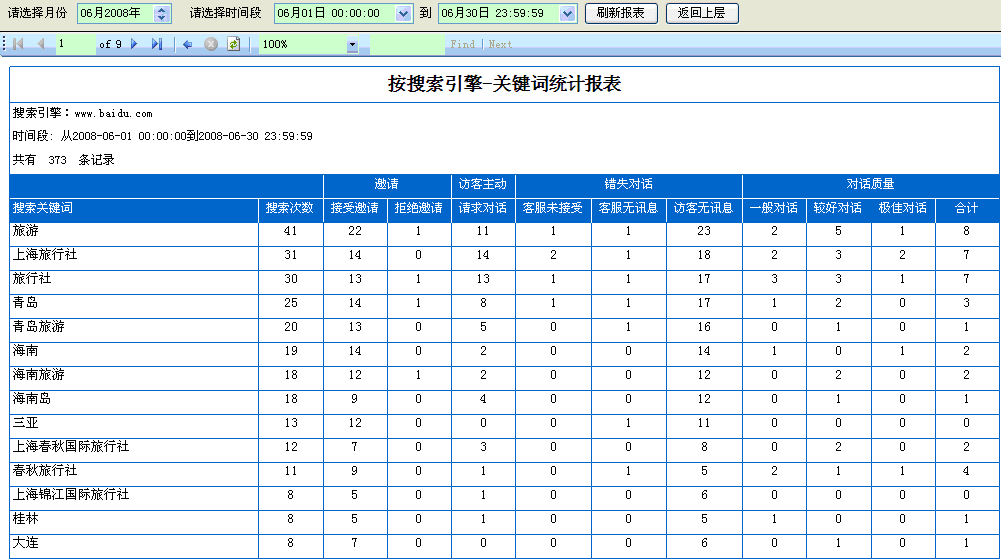 8. 按搜索關(guān)鍵詞統(tǒng)計對話:所有搜索關(guān)鍵詞的收據(jù)統(tǒng)計,通過我們提供的關(guān)鍵詞報表,客戶能更好的了解,訪客喜歡通過哪些關(guān)鍵詞在搜索引擎上邊找尋自己需要的信息,這樣客戶可以及時調(diào)整自己的關(guān)鍵詞,讓自己的網(wǎng)站更容易被訪客找到,如(圖6);