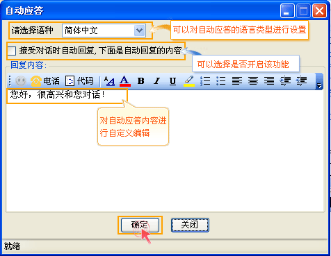 • 打開自動應答設置窗口,對自動應答答復內容進行自定義設置,如(圖2);