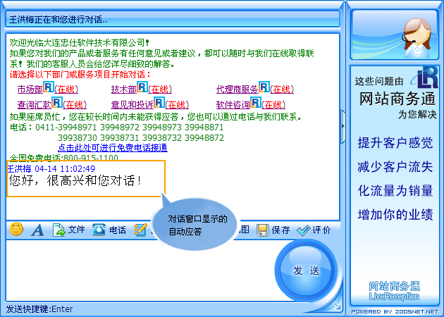 • 自動應答功能可以在訪客進入對話的第一時間就自動發送一條友好的問候信息給訪客。通過自動應答可以讓訪客感覺到高效優質的服務,同時也為客服人員免去了一些必要操作,節省了時間,真正意義上提高了客服人員接待效率。