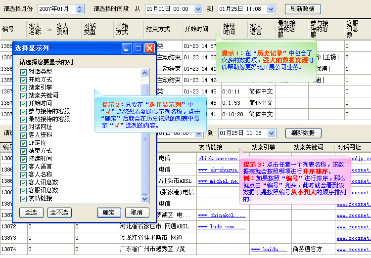 (1).數據列表資源:打開“歷史記錄”我們可以看到一個數據列表,其中網站商務通軟件提供的可顯示列就有二十多項,您對可顯示列進行設置,還可以在列表上單擊某一列表名稱對整個表項按此列進行升序排序,如(圖1);