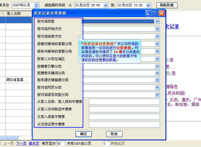 (2).分類查找功能,網站商務通的每一組數據都是以不斷累加的形式積攢保存起來的,每一個微小的數據網站商務通都會為您保存,所以數據量非常的龐大,在這樣的情況下與之相匹配的“歷史記錄分類查找”功能也就同時被開發出來,此功能不僅可以對以下十多項分類進行查詢,還可以再對每一類型做第三次劃分,使您能夠輕松快速地找到您想找的相應數據信息,如(圖2、圖3、圖4);