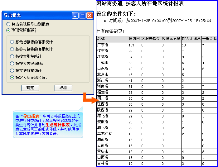 (5).導出報表功能,網站商務通軟件為您提供了強大的導出報表功能,您可以按照“導出報表”中提供的不同的類別進行分類統計而后成生詳細的報表,此報表您還可以把它保存到您的本地電腦上,做為一個長期的統計數據來保存,無需您再費力的進行市場調研再來制作繁瑣的表格,如(圖5);