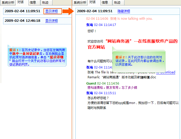 - 強大的數據資源是網站商務通軟件的一大特色之一,網站商務通軟件會對每一位訪問您網站的訪客做一個詳細的數據備份,從它自身的一系列資料到對話及其在您網站上所做的任何操作情況都為您在數據庫中做以備案,并且可以隨時在“歷史記錄”中查詢及導出報表。