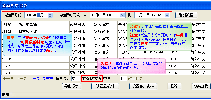(7).查看某一時間段內的對話記錄總數,只要您選擇一個時間段網站商務通都會自動對在這段時間段內產生的對話做一個統計,最終顯示在“查看歷史記錄”對話窗口的下方,如(圖7);