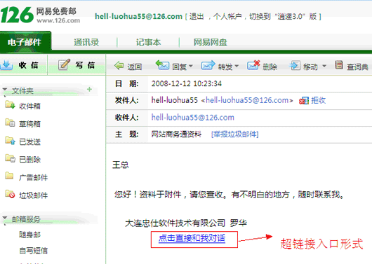 3、如您在郵件里面做超鏈接入口。客人收到郵件后,點對話,網站商務通會知道此訪問是收到您的郵件后點對話和您交流的。