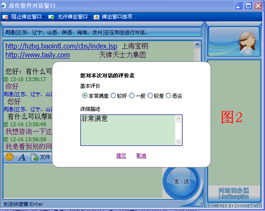 網站客服的對話質量直接影響到公司訂單的成交比例,為了讓客服提高自己的服務質量,對此我們在訪客和客服對話過程中提供了訪客評價功能,讓訪客對客服的服務質量進行評價,這樣能很好的監督客服的服務質量。如下圖: