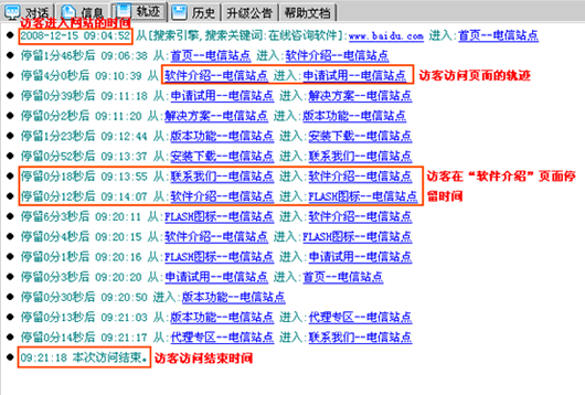 能“看見”訪客的訪問頁面軌跡,訪客在每個頁面的進入時間,停留時間以及離開網站的最后時間,知道客戶的心理動態。