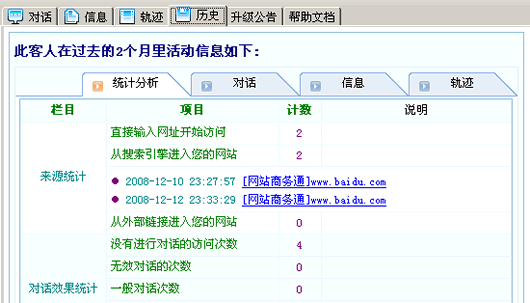 在“歷史”選項卡“統計分析”中可以查看訪客最近兩個月的訪問來源軌跡信息
