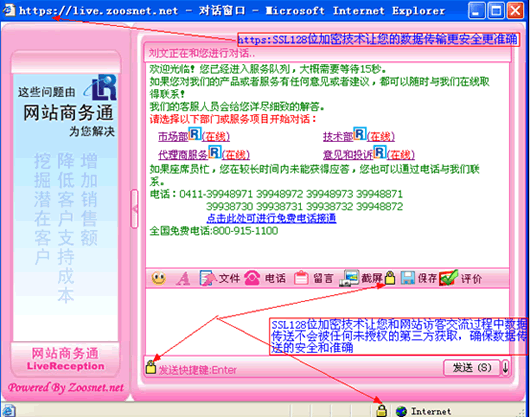 SSL128 <Security Socket Layer>加密技術讓您與網站訪客的聊天更安全從而不用擔心您的聊天內容被未授權的第三方獲取,確保您的數據發送到正確的客戶機和服務器,維護數據的完整性,確保數據在傳輸過程中不被竊取或者改變。