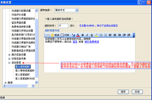 自動回復功能可以讓網站訪客進入網站的第一時間內就收到接待信息,此功能可以讓訪客感覺到優良的服務,從而不會因為客服接待訪客超時而失去任何一個客戶。