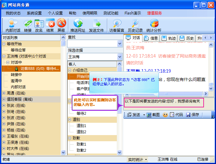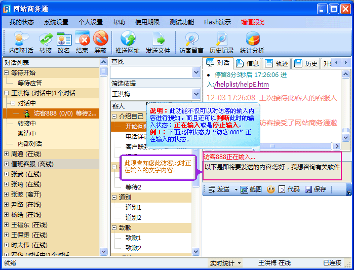 - 訪客消息預知功能是指訪客在對話窗口中輸入并未發送的內容可以在網站商務通客服端軟件中預先看到,以便于您提早對訪客想說的話進行判斷處理。