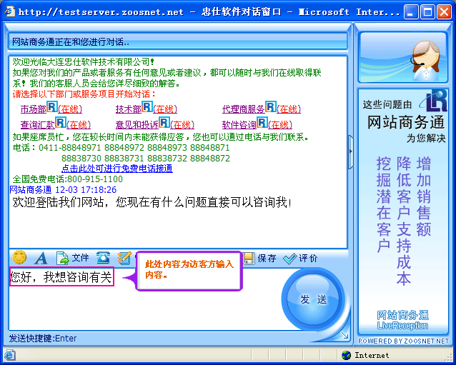(1).此功能為網站商務通 V7.0版本的新功能,下圖為訪客方的輸入內容如(圖1);