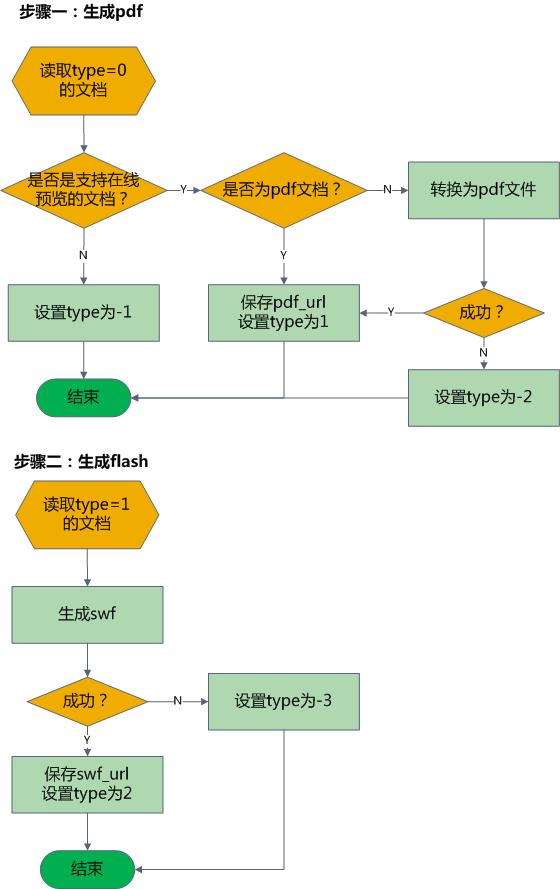 下圖是文檔轉(zhuǎn)化到swf的一個(gè)流程,其中type是文檔的一個(gè)狀態(tài)標(biāo)識(shí)(0表示未處理過的文檔,1表示已生成pdf,2表示已生成flash,-1表示不受支持的文檔格式,-2表示轉(zhuǎn)化為pdf失敗,-3表示轉(zhuǎn)化為flash失敗)
